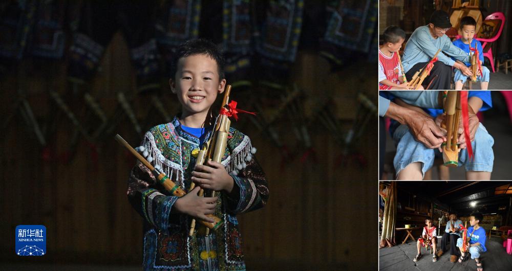 拼版照片:左圖為廣西融水苗族自治縣桿洞鄉黨鳩村9歲的小學(xué)生梁文雄(7月5日攝);右圖為梁文雄跟著(zhù)爺爺學(xué)習吹奏蘆笙(照片均攝于7月6日)。梁文雄很喜歡吹蘆笙,每到假期,他都會(huì )跟爺爺、爸爸學(xué)習吹蘆笙。
