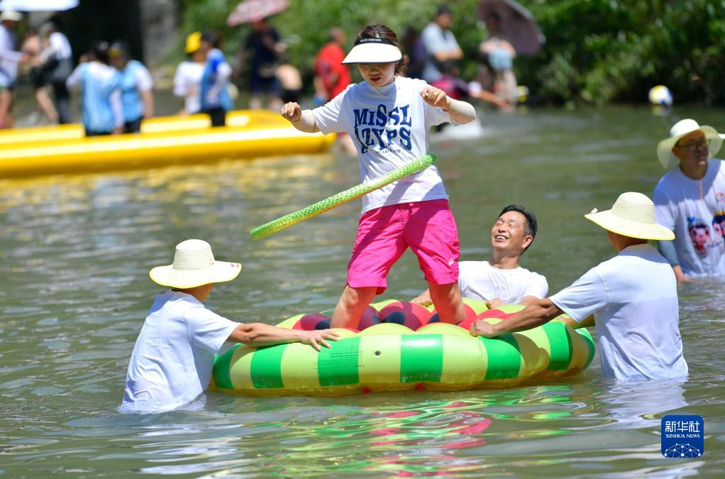盛夏時(shí)節,湖北省恩施土家族苗族自治州宣恩縣高羅鎮板寮村舉行一場(chǎng)以“水上排球”“水上拔河”“水桶接力”“水上呼啦圈”等為內容的趣味水上運動(dòng)會(huì ),吸引全鎮各村組隊參與。村民們在溪水中參與趣味運動(dòng),樂(lè )享清涼。