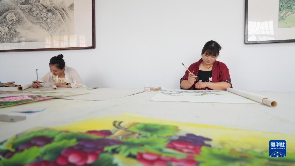 7月24日,畫(huà)師在山東省巨野縣永豐街道辦事處洪廟村鄉村畫(huà)院繪制工筆畫(huà)作品。