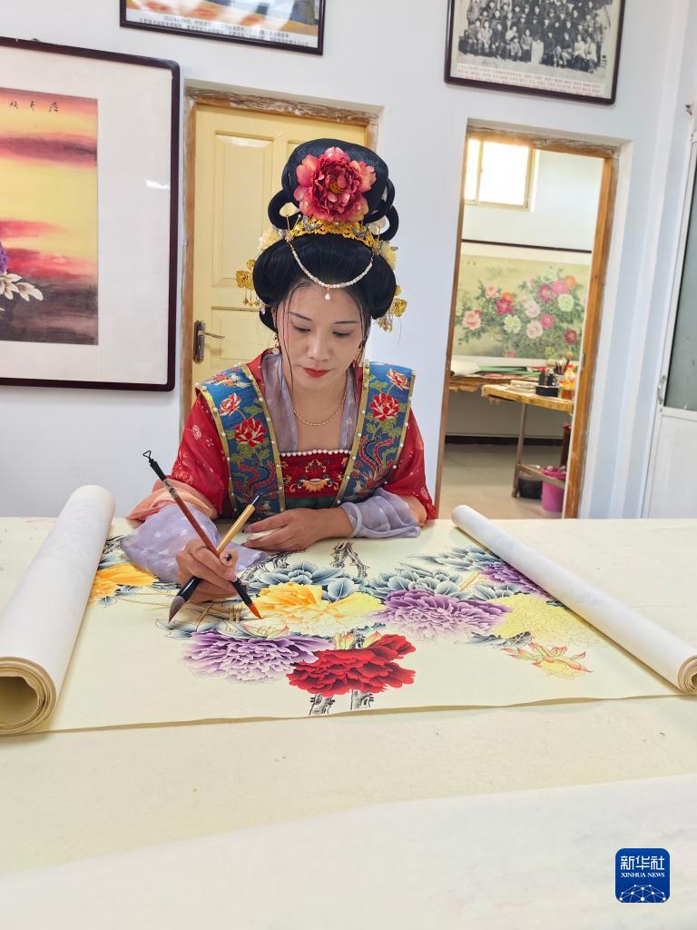 7月24日,畫(huà)師在山東省巨野縣永豐街道辦事處洪廟村鄉村畫(huà)院繪制工筆畫(huà)作品。