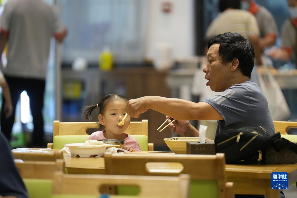 7月25日,老人帶著(zhù)小孩在河北省唐山市路北區橡樹(shù)灣社區養老服務(wù)中心就餐。