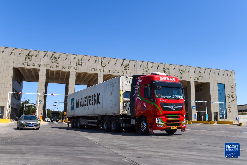 一輛滿(mǎn)載貨物的貨車(chē)駛出新疆阿拉山口綜合保稅區(7月24日攝)。