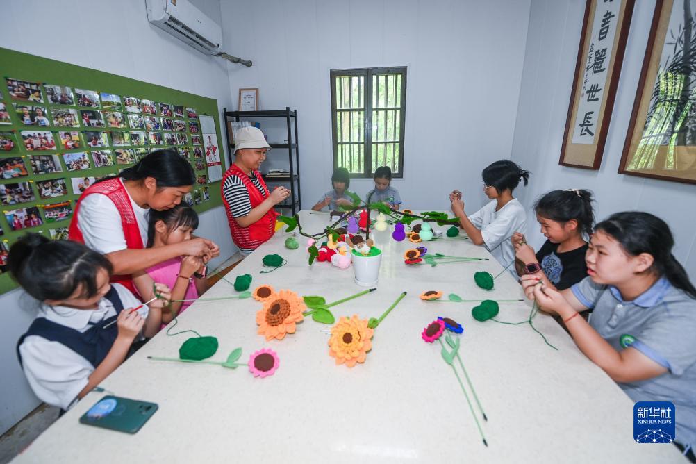 7月25日,在諸暨市馬劍鎮上和村的侯門(mén)山鄉村圖書(shū)館,暑托班的孩子們在志愿者老師的帶領(lǐng)下學(xué)習用毛線(xiàn)編織鉤織花。