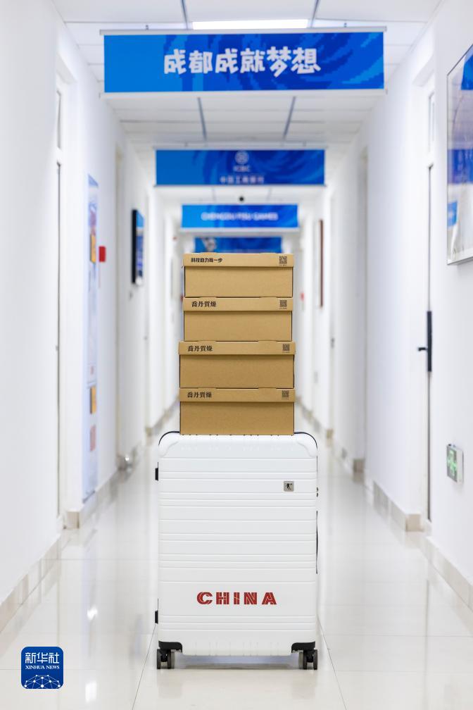 這是7月24日在第31屆世界大學(xué)生夏季運動(dòng)會(huì )大運村中國代表團駐地拍攝的代表團成員配發(fā)裝備。