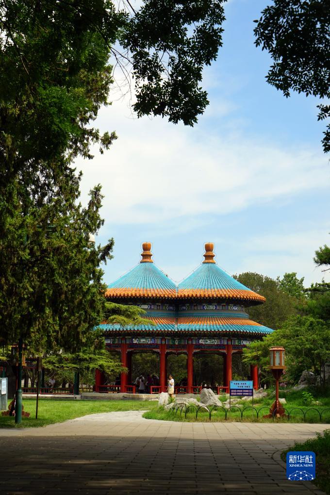 游客從天壇雙環(huán)萬(wàn)壽亭前走過(guò)(7月10日攝)。天壇始建于明永樂(lè )十八年(1420年),是世界上現存規模最大、保存最完整的古代祭天建筑群,1998年被列入世界文化遺產(chǎn)名錄。