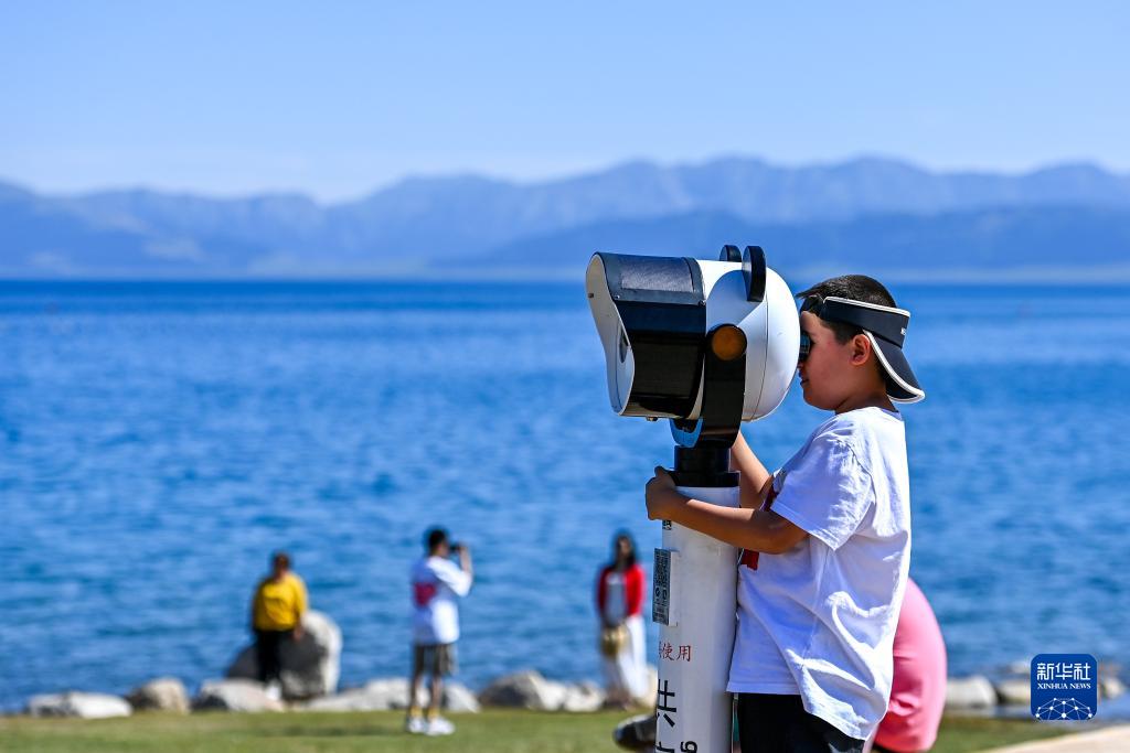 7月25日,一名小朋友在新疆賽里木湖景區使用望遠鏡看風(fēng)景。