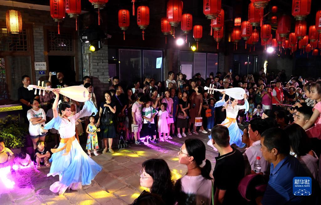 游客在陜西省漢中市留壩縣老街上觀(guān)賞文藝演出(7月22日攝)。