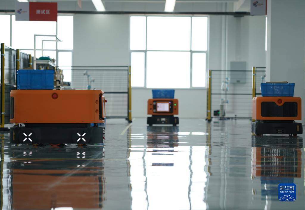7月25日,在位于淄博市臨淄區的遨博(山東)智能機器人有限公司,機器人在運送物品。
