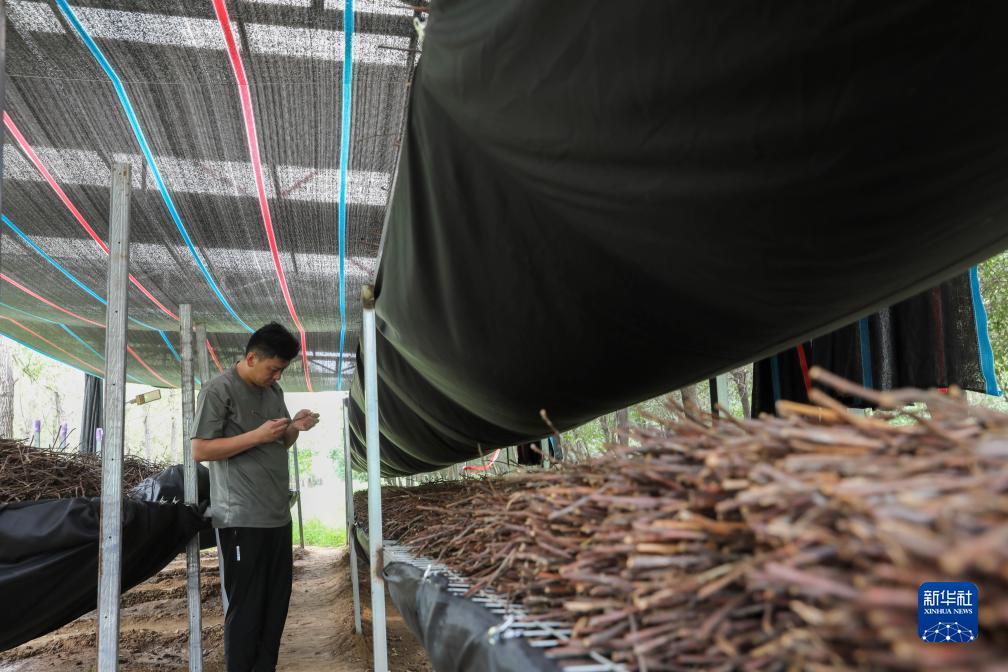 7月24日,寶豐縣鬧店鎮連店村一處林下金蟬養殖基地的工作人員在查看金蟬幼蟲(chóng)發(fā)育情況。