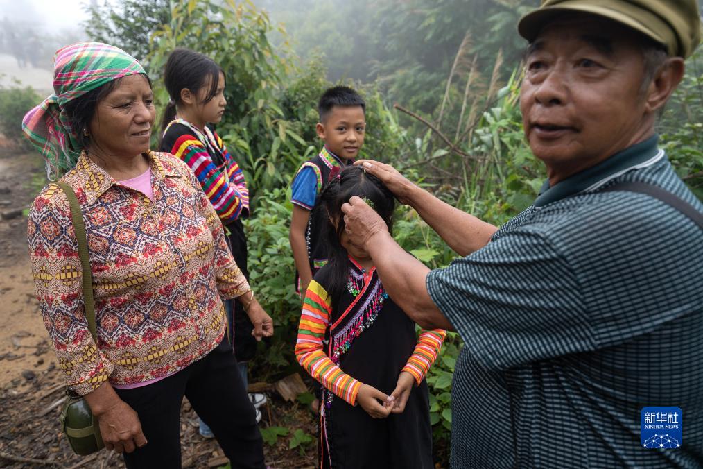 7月23日,張普忠(右一)把揉碎的草藥“納次”放到小孫女張麗紅的額頭,問(wèn)她有什么感覺(jué)。新華社記者 費茂華 攝