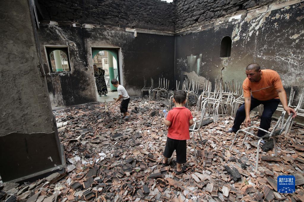 7月25日,居民在阿爾及利亞貝賈亞省一間被野火燒毀的房屋內收拾物品。