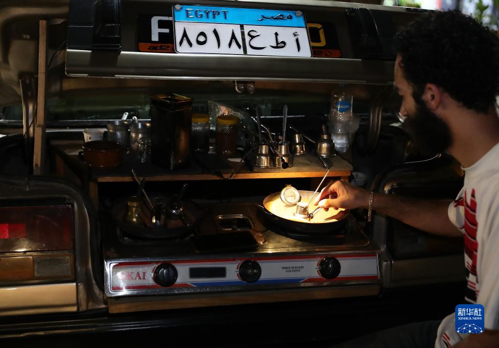 7月25日,在埃及開(kāi)羅街頭,一名男子用汽車(chē)后備箱中的設備制作咖啡。