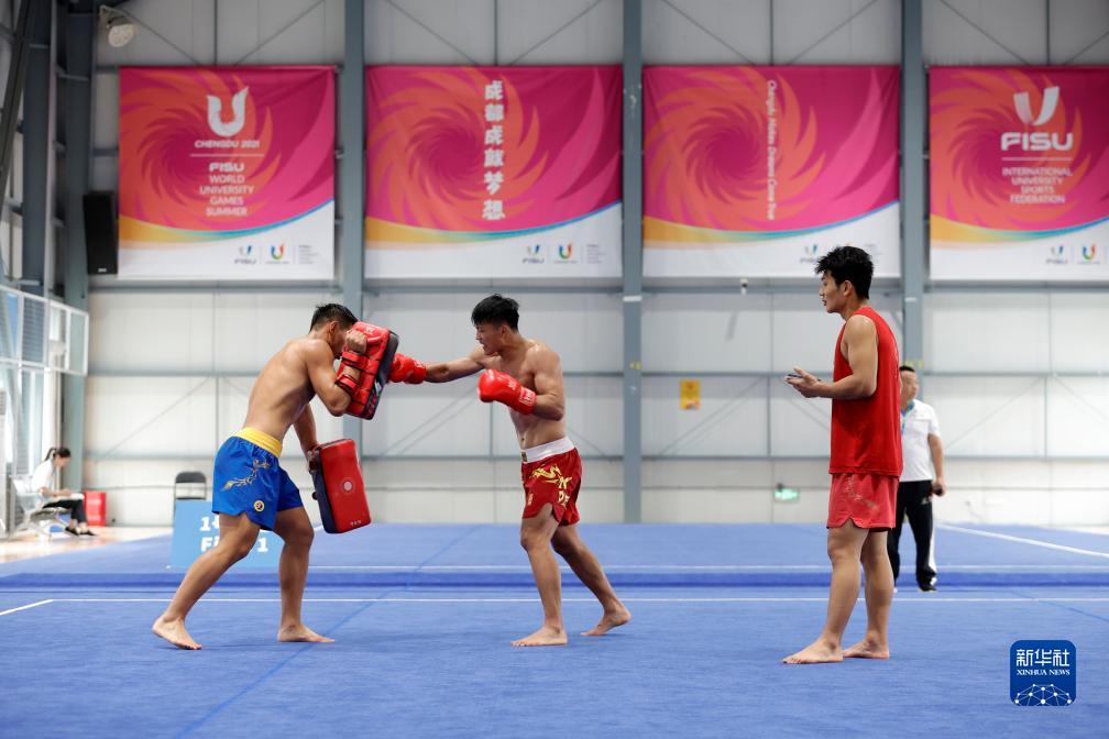 7月25日,參加第31屆世界大學(xué)生夏季運動(dòng)會(huì )武術(shù)散打比賽的中國選手在成都城北體育館訓練。