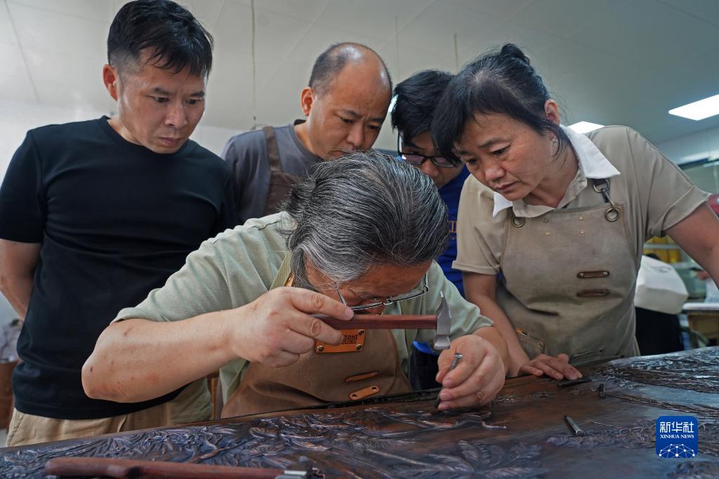 黃俊軍(前)在給徒弟們演示銅雕技法(7月13日攝)。