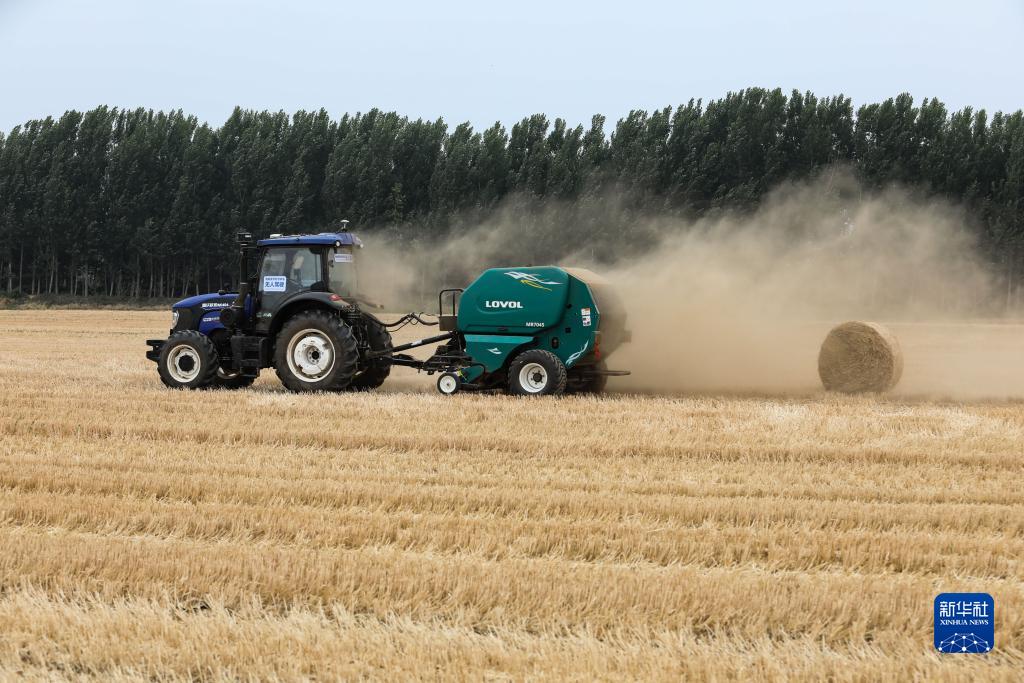 在濰坊市坊子區濰柴雷沃智慧農業(yè)示范基地,一輛無(wú)人駕駛農機進(jìn)行打捆作業(yè)(6月17日攝)。