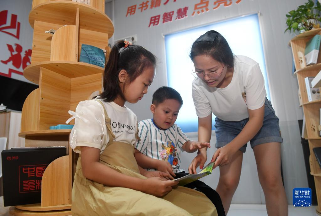 7月26日,在廣西上橫高速公路建設項目部,來(lái)自陜西省寶雞市的荔若溪(左一)和來(lái)自廣西來(lái)賓市的韋靖楷(左二)在大人的指導下看書(shū)。