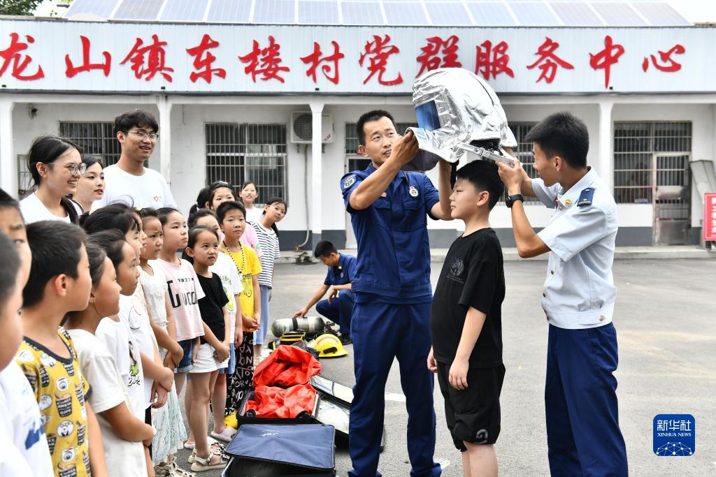 7月26日,在莒縣龍山鎮東樓村“小草學(xué)堂”,莒縣消防救援大隊的指戰員為孩子試穿防護服并講授消防安全知識。