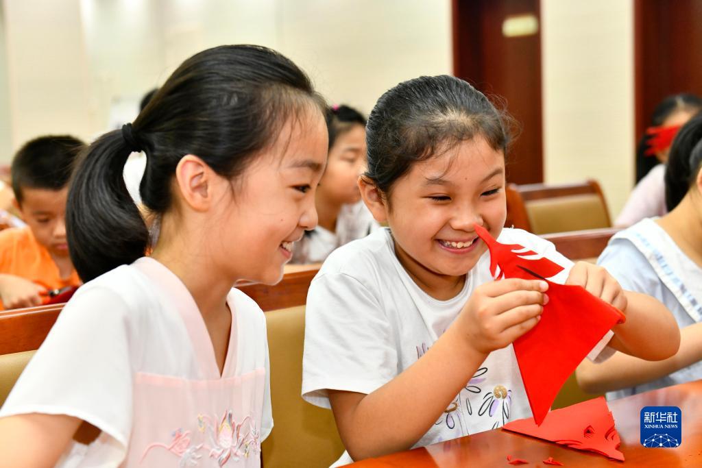 7月26日,在莒縣城陽(yáng)街道岳家村“小草學(xué)堂”,孩子們在學(xué)習剪紙。