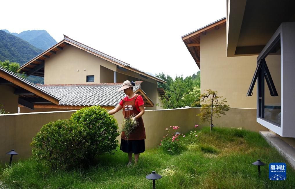 7月24日,陜西省漢中市留壩縣玉皇廟鎮秦嶺1號民宿內的房間管家在清理院內雜草。