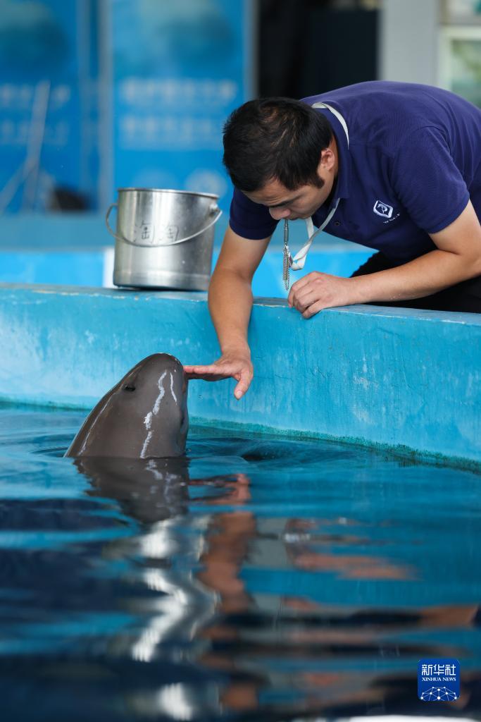 7月12日,中國科學(xué)院水生生物研究所白鱀豚館訓練員王超群在給長(cháng)江江豚喂食。