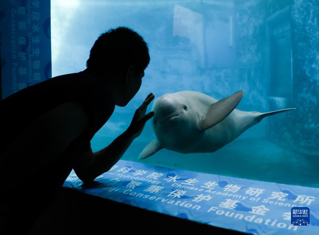 7月12日,中國科學(xué)院水生生物研究所研究人員在觀(guān)察白鱀豚館內的長(cháng)江江豚。