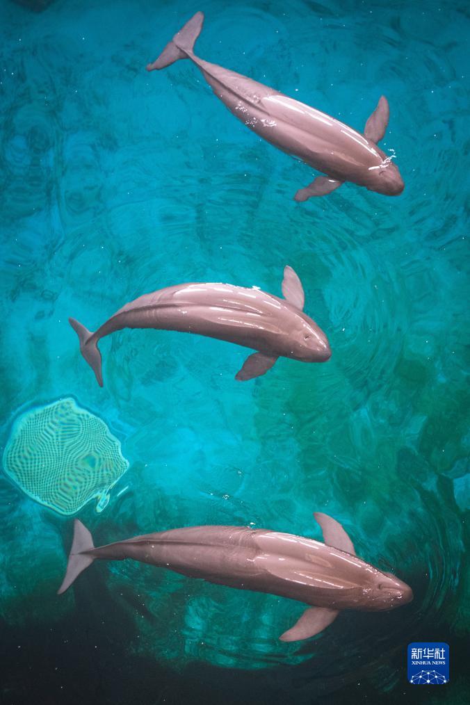 6月29日,三頭長(cháng)江江豚在白鱀豚館水中游動(dòng)。