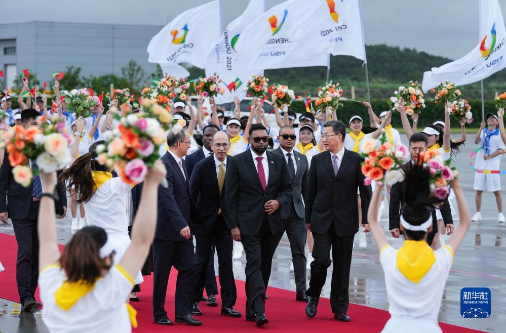 成都大運會(huì )丨來(lái)華出席成都大運會(huì )開(kāi)幕式并訪(fǎng)問(wèn)的圭亞那總統阿里抵達四川省成都市