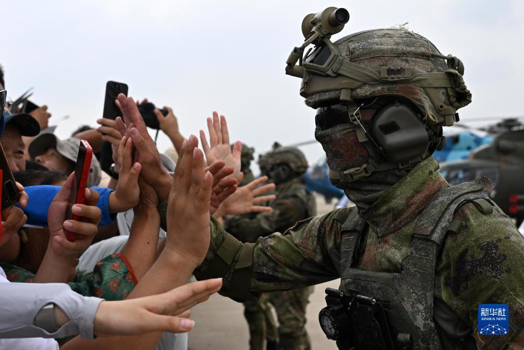 7月27日,在空軍航空開(kāi)放活動(dòng)·長(cháng)春航空展首個(gè)公眾日,空降兵與觀(guān)眾進(jìn)行互動(dòng)。