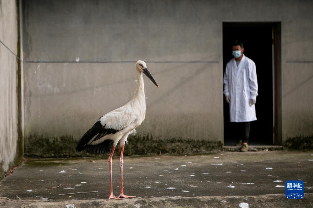 在江西省野生動(dòng)物救護中心,工作人員在觀(guān)察東方白鸛的受傷情況(7月16日攝)。
