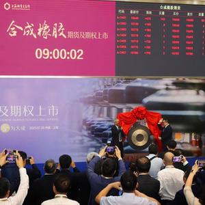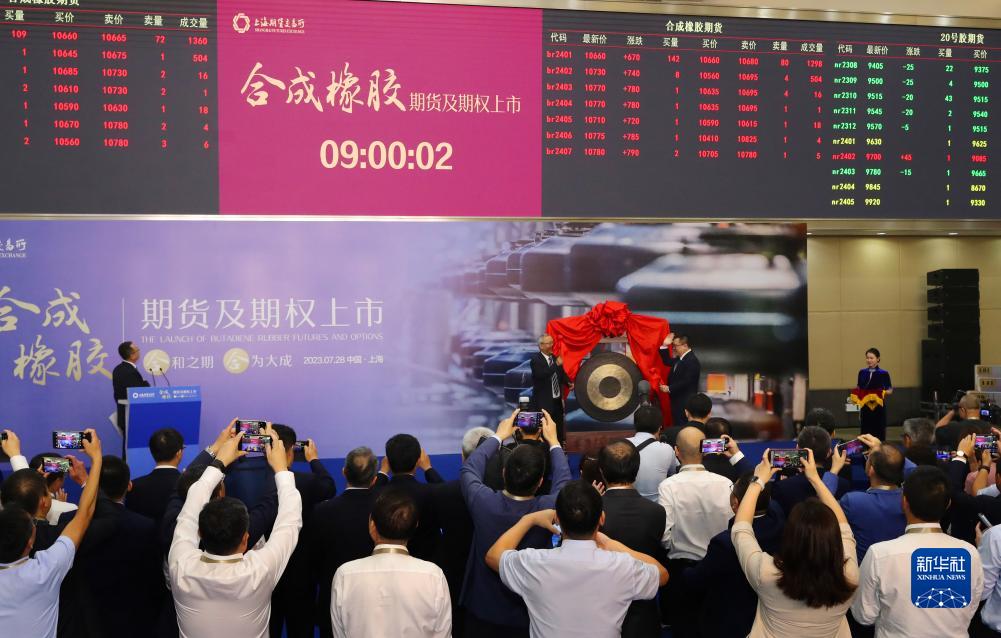 7月28日在上海期貨交易所拍攝的合成橡膠期貨及期權上市開(kāi)盤(pán)鳴鑼儀式。