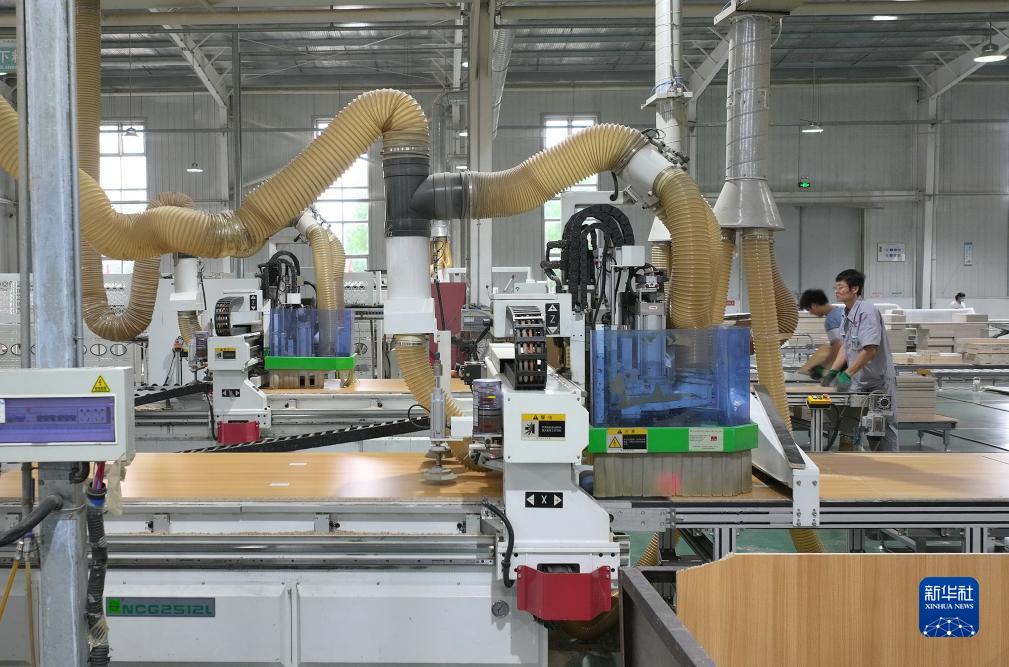 7月28日,工人在河北省唐山市蘆臺經(jīng)濟開(kāi)發(fā)區一家具企業(yè)的生產(chǎn)車(chē)間工作(無(wú)人機照片)。