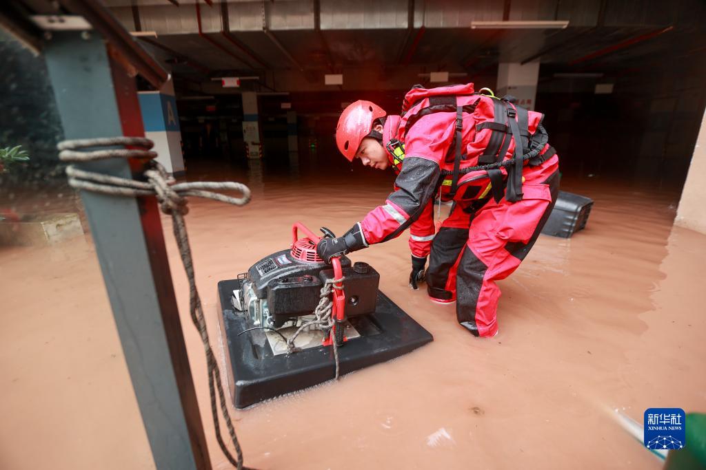 7月28日,重慶大渡口區天安數碼城地下車(chē)庫內,救援人員利用消防浮艇泵、手臺機動(dòng)泵等器材抽取積水。