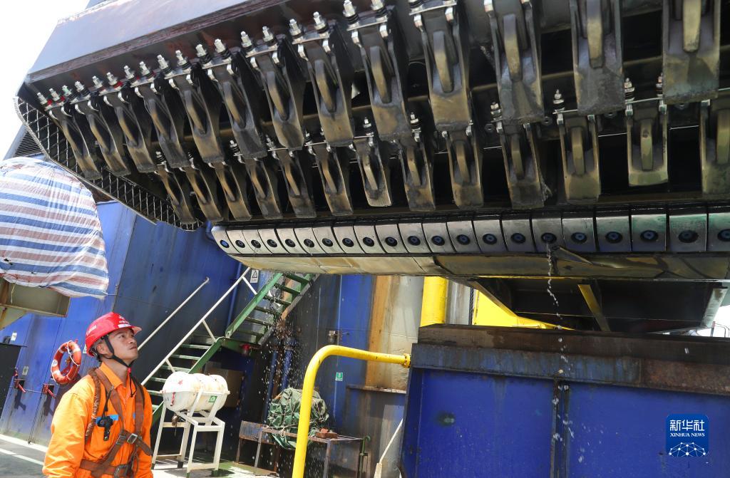 7月26日,一名水手在對完成起耙的“新海鳳”輪右舷耙頭進(jìn)行例行安全檢查。