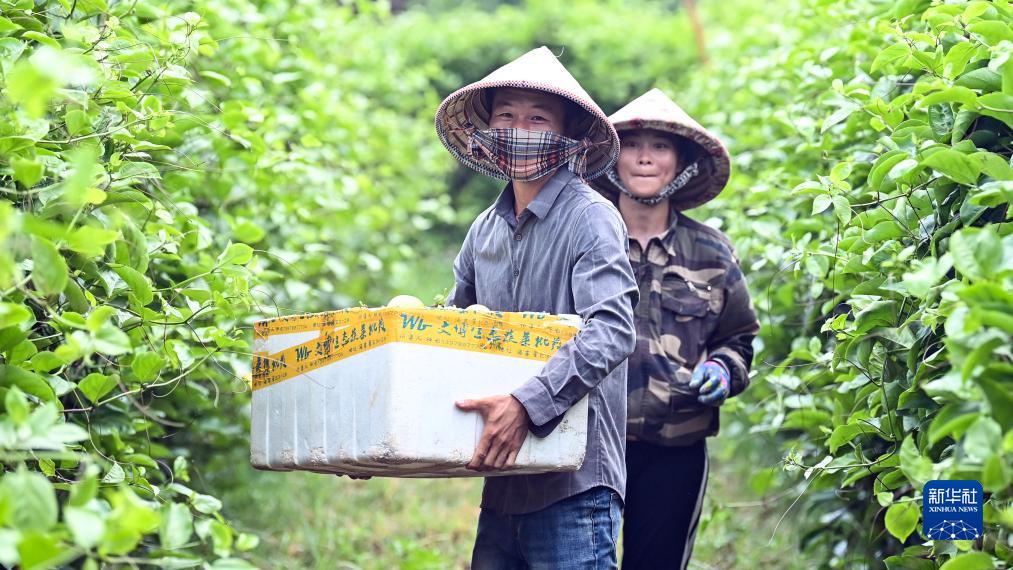 7月28日,在欽州市欽南區海豚灣百香果園,果農在采摘成熟的“欽蜜9號”黃金百香果。