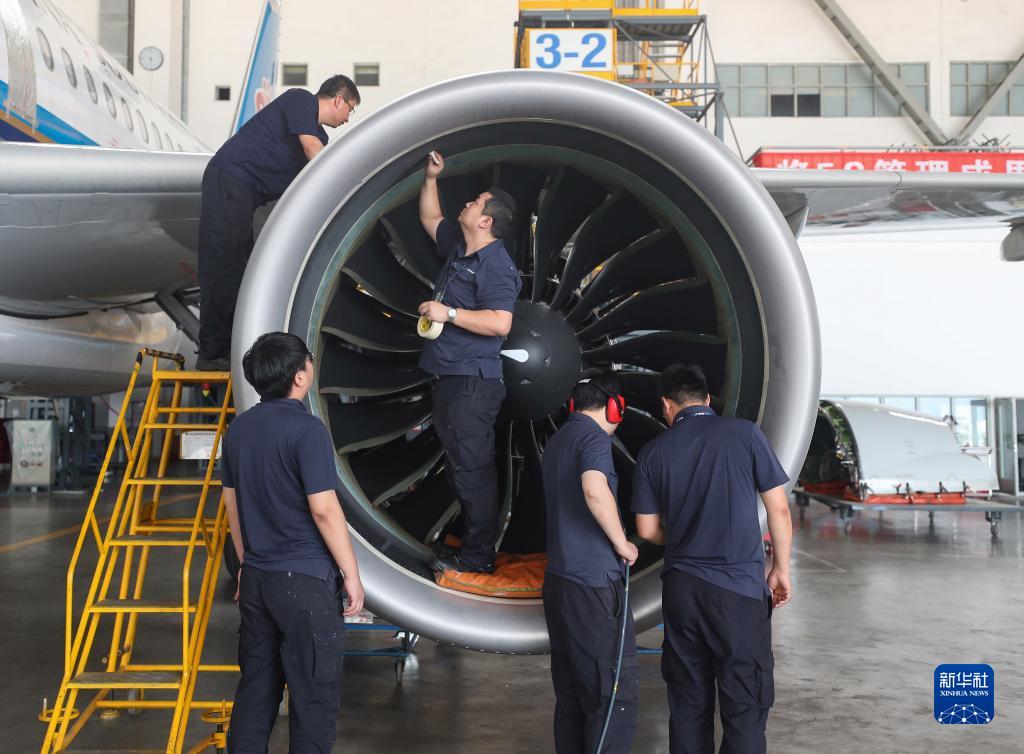 7月28日,工作人員在南航工程技術(shù)分公司沈陽(yáng)基地3號機庫進(jìn)行飛機維護。