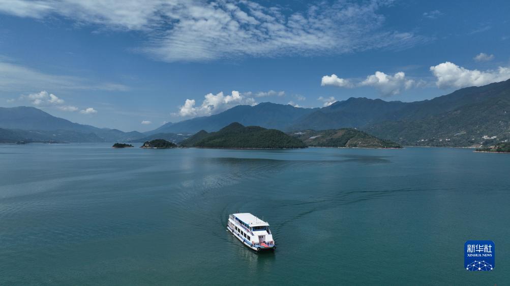 7月26日,游客在湖南省資興市東江湖乘船游覽(無(wú)人機照片)。