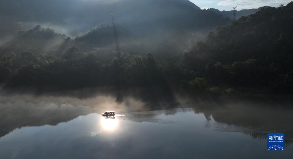 7月26日,游客在湖南省資興市小東江上乘船游覽(無(wú)人機照片)。