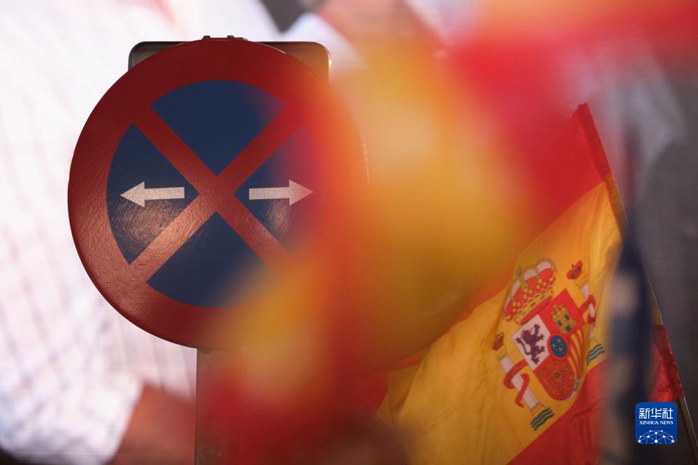 這是7月23日在西班牙馬德里人民黨總部大樓外拍攝的一處路標。