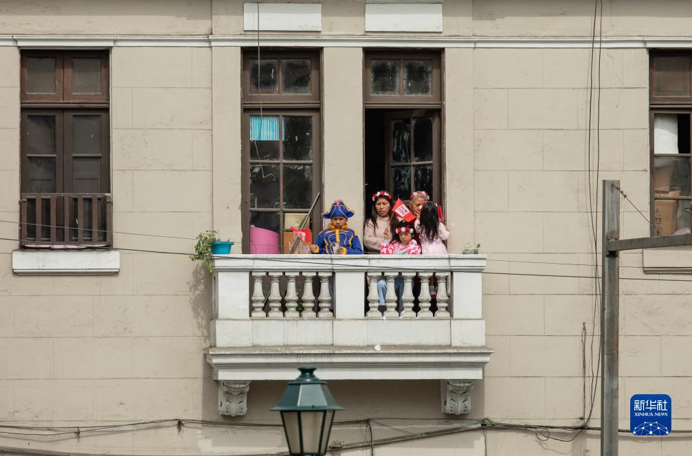 7月28日,在秘魯首都利馬,民眾在陽(yáng)臺觀(guān)看獨立日慶?;顒?dòng)。