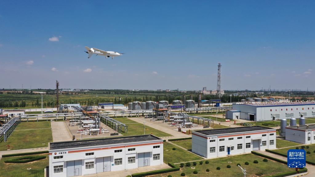 無(wú)人機在中國石油長(cháng)慶油田第三采氣廠(chǎng)蘇里格天然氣第二處理廠(chǎng)巡檢(7月25日攝,無(wú)人機照片)。