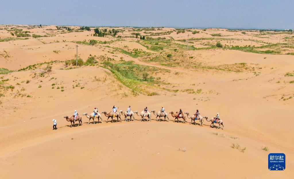 游客在鄂爾多斯市達拉特旗境內庫布其沙漠中的銀肯塔拉景區體驗騎駱駝(7月29日攝,無(wú)人機照片)。