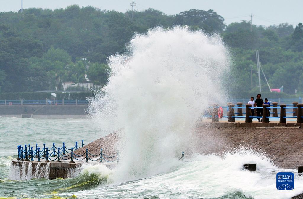 7月29日,在山東省青島市澳門(mén)路,海浪拍向岸邊。