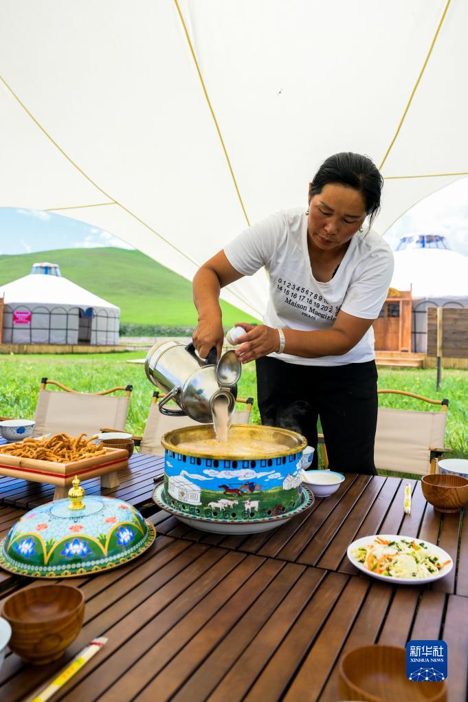 7月25日,白薩仁為游客準備奶茶。