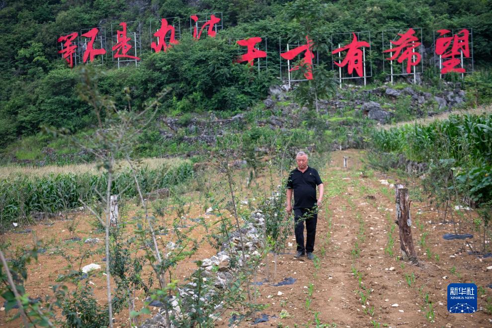 劉登榮走在木者村“摸石谷”中自己帶領(lǐng)村民建成的“三?!迸_地上(7月27日攝)。新華社記者 陳欣波 攝