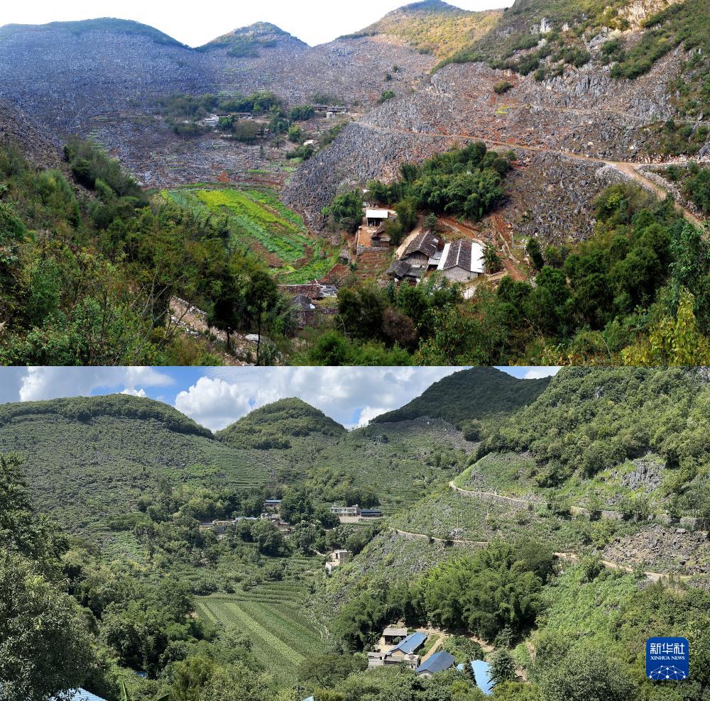 這是一張拼版照片:上圖為1991年拍攝的西疇縣大鄔麻村改造前的石漠化情況(西疇縣融媒體中心供圖);下圖為2023年7月26日拍攝的西疇縣大鄔麻村改造后的情況(新華社記者費茂華攝)。新華社發(fā)