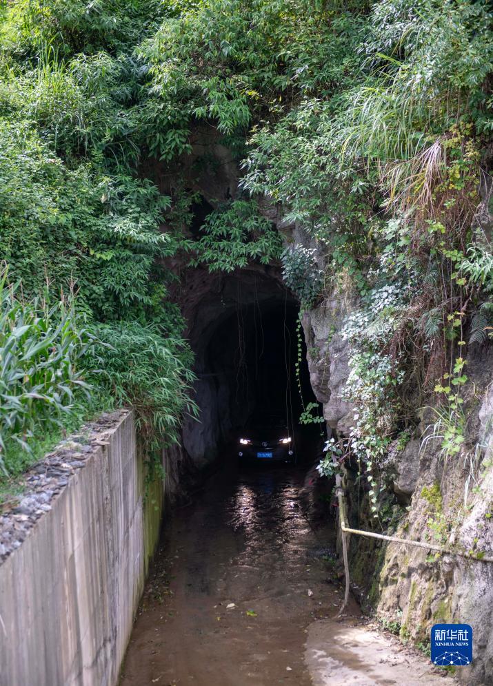 一輛汽車(chē)從劉家塘村村民開(kāi)鑿的“勝天洞”內開(kāi)過(guò)(7月27日攝)。新華社記者 陳欣波 攝