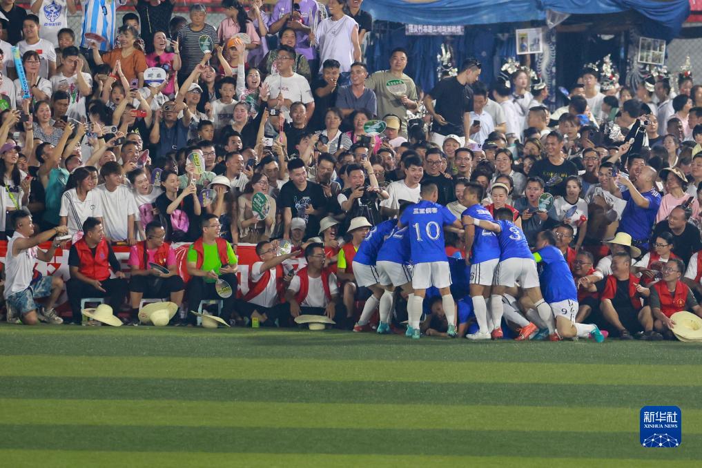 7月29日,車(chē)江一村隊球員在決賽中取得進(jìn)球后慶祝。新華社記者 劉續 攝