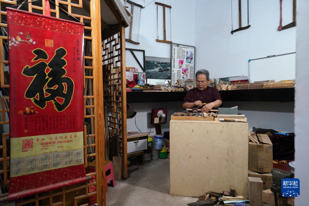 7月30日,侯全辰在工作間內制作孔明鎖。