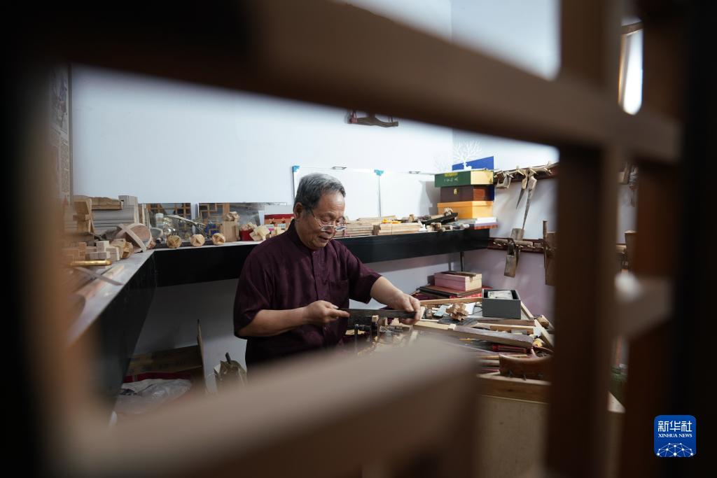 7月30日,侯全辰在工作間內制作孔明鎖。