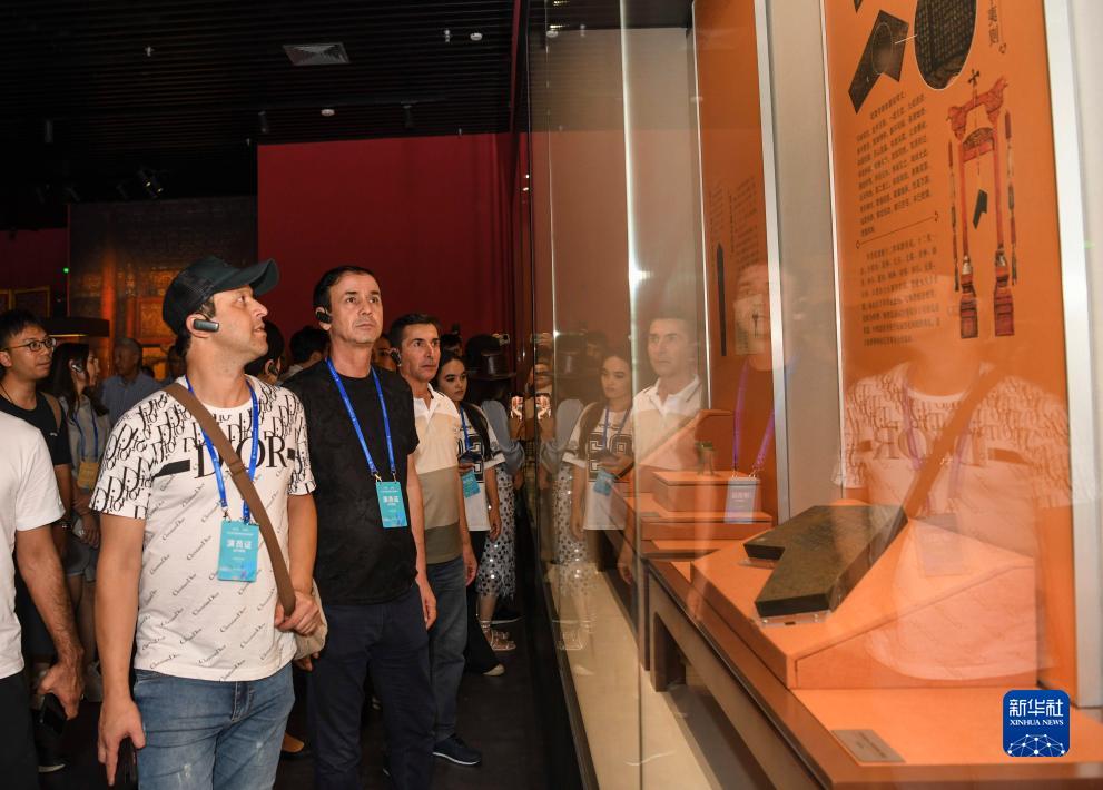 來(lái)自塔吉克斯坦的舞蹈演員在新疆博物館“故宮廳”參觀(guān)(7月29日攝)。